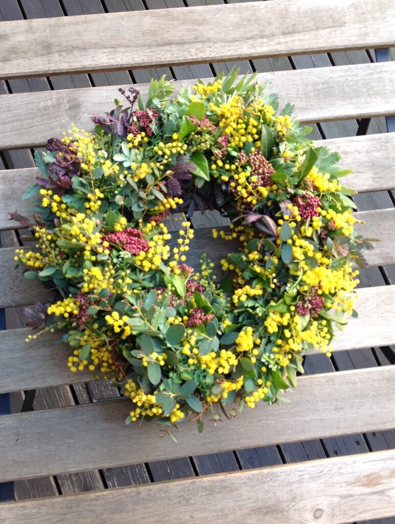 ミモザリースのワークショップでは、このようなリースをみなさんでつくりました。