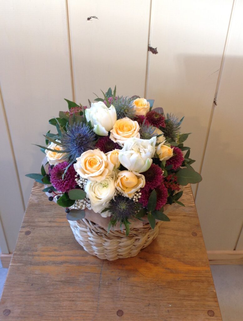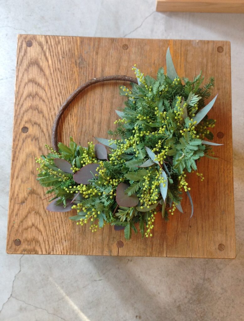 2026-01-24 春のお花とリース チューリップ、ラナンキュラス、アネモネ、ヒヤシンスなど、少しずつ春のお花が入っています。ミモザとユーカリの三日月リースなども、おつくりします。(写真は直径約20cm・2,500円) hanayanichi