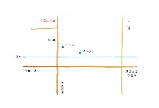 「銀閣寺道」交差点より一筋西、白川疎水を少し北へ上がったところ、「清水とうふ店」さんと「魚広」さんのすぐそばです。